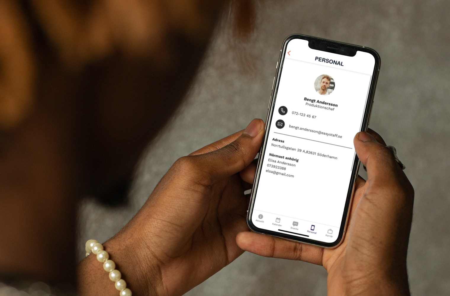 Easy Staff är integrerat med ert personalregister för att göra kontaktuppgifter lättillgängliga för medarbetare i appen och för att se till att uppgifterna alltid är uppdaterade.